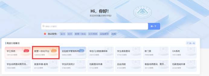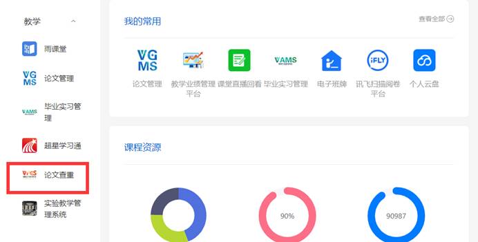 “论文查重检测”应用进入方式如下:从学校官网顶部“一站式门户”登录,进入在“教管一体化平台”,点击页面左侧“教学”栏下“论文查重”应用,进入论文检测页面,选择“大学生版”,录入题目和作者姓名,上传检测文档,点击“下一步”即可开始付费检测。