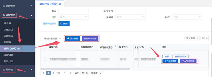 1.在过程管理中“评阅(答辩)稿”环节开展查重检测和AIGC检测。两种检测分别提交,首次检测均免费,限一次。