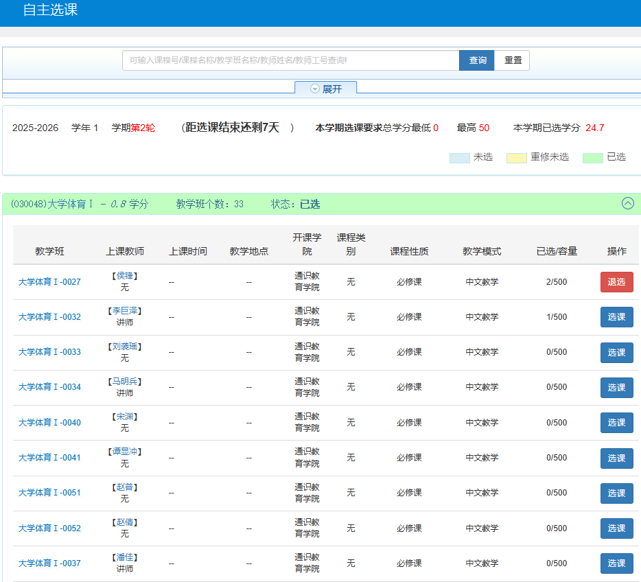 3.涉及到学籍变动,学期中途办理复学手续到2025级的同学请主动到教务处办理添加课程事宜,否则修读课程不全将影响毕业;已选体育俱乐部班级的同学不必选课;参军入伍退役的同学也需要选课(请提供材料供授课老师打分)。