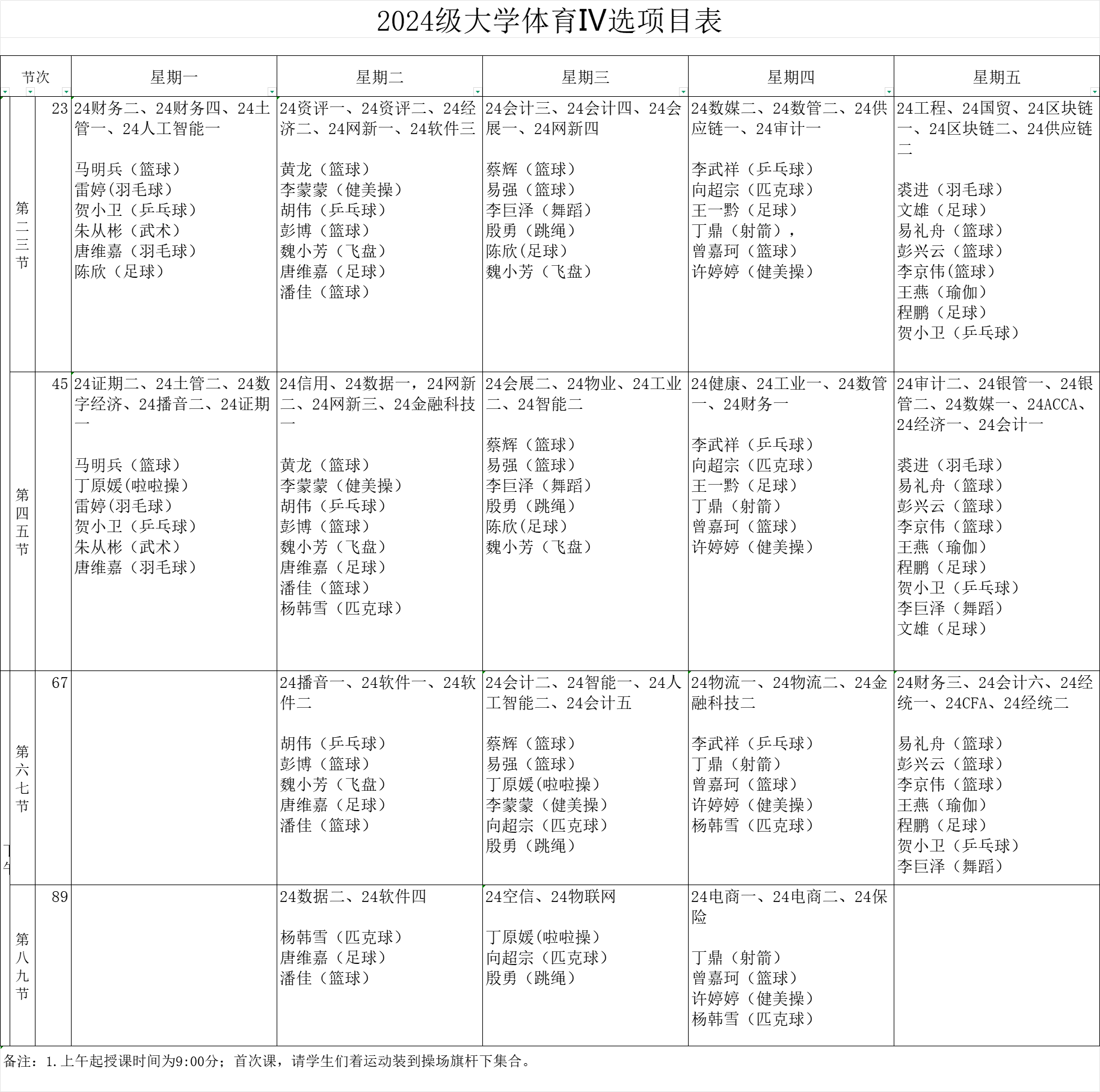 1.为保证每位同学在规定时间段内能选课,2024级同学实行只能在“在指定时间段内自行选课”的方式,学生只能在规定的时间段内进行选课,不同教师所教项目各不相同,请同学们仔细核对附表并根据自身意愿选择,每个学生只能选择一位体育老师及一个体育项目,已选体育俱乐部同学不必选课。