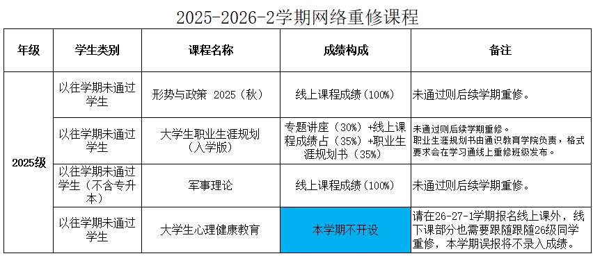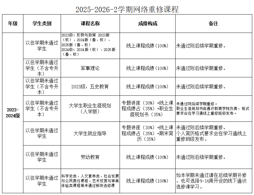 1.在校学生重修以往学期的《大学生心理健康教育》、《军事理论》、《大学生职业生涯规划》入学版、《大学生就业指导》、《大学生创业基础》、《形势与政策》可在网上选课,选课、学习时间:3月18日-6月7日(2022级为5月1日截止)。