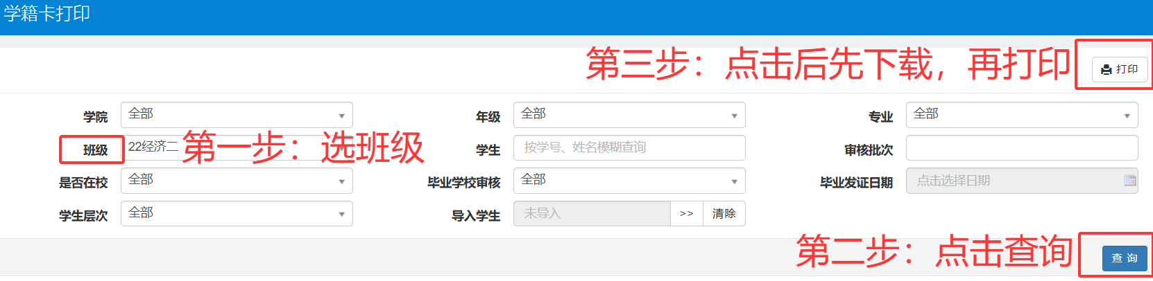 3.按所属班级筛选后点击「查询」,显示本班学生信息后直接点击页面右上角「打印」按钮,待学生学籍卡信息加载完成后,点击右上角下载按钮导出本班学生学籍卡;