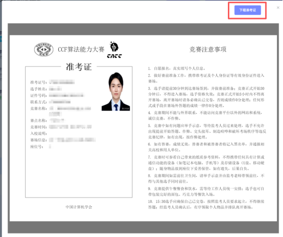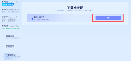 准考证发布之后,参赛者可“查看”准考证信息,进行准考证下载。