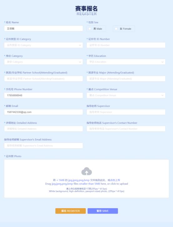 在“赛事报名”可提交报名信息。填写相关报名信息,若在个人信息里补充过证件号、身份、学历信息、一寸照,在报名时这些信息会自动填充。